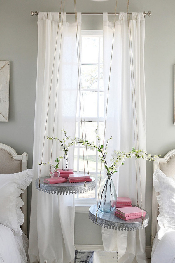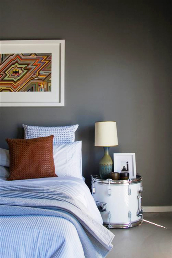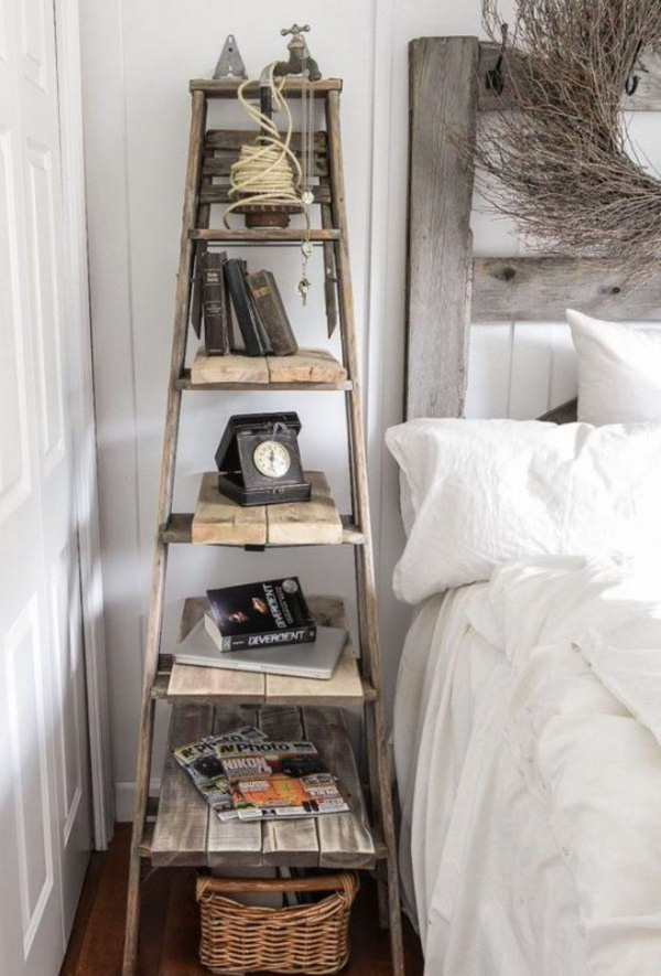 Đừng nghĩ rằng tủ đầu giường sẽ chỉ là tủ hay cùng lăm là bàn mà thôi. Một chiếc thang thay một chiếc tủ/bàn thì sao? Các chân thang bạn có thể bắc gỗ để chứa đồ nào là sách báo, đồng hồ báo thức, điện thoại để bàn vv. Quá tuyệt ý chứ!