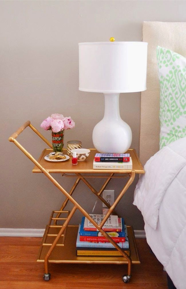 Chiếc tủ/bàn kéo này gồm hai tầng. Tầng trên bạn có thể đặt đèn ngủ, điện thoại, bình hoa và tầng dưới có thể là vài cuốn sách hay ho bạn thích đọc trước khi đi ngủ. Tiện lợi của chiếc bàn này chính là dễ di chuyển, bạn chỉ việc kéo đi thôi, chẳng cần phải bê vác gì cả. Hơn nữa nét độc đáo trông giống như một chiếc xe đẩy hàng trong siêu thị chính là điểm hay ho của chiếctủ đầu giường này.