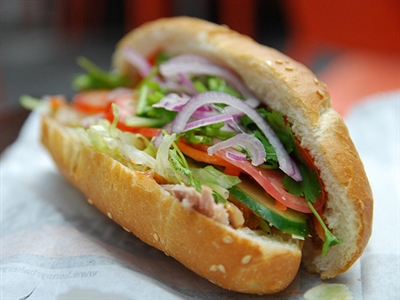 – Xẻ đôi bánh mì rồi cho mì vừa xào vào làm nhân là hoàn thành!
